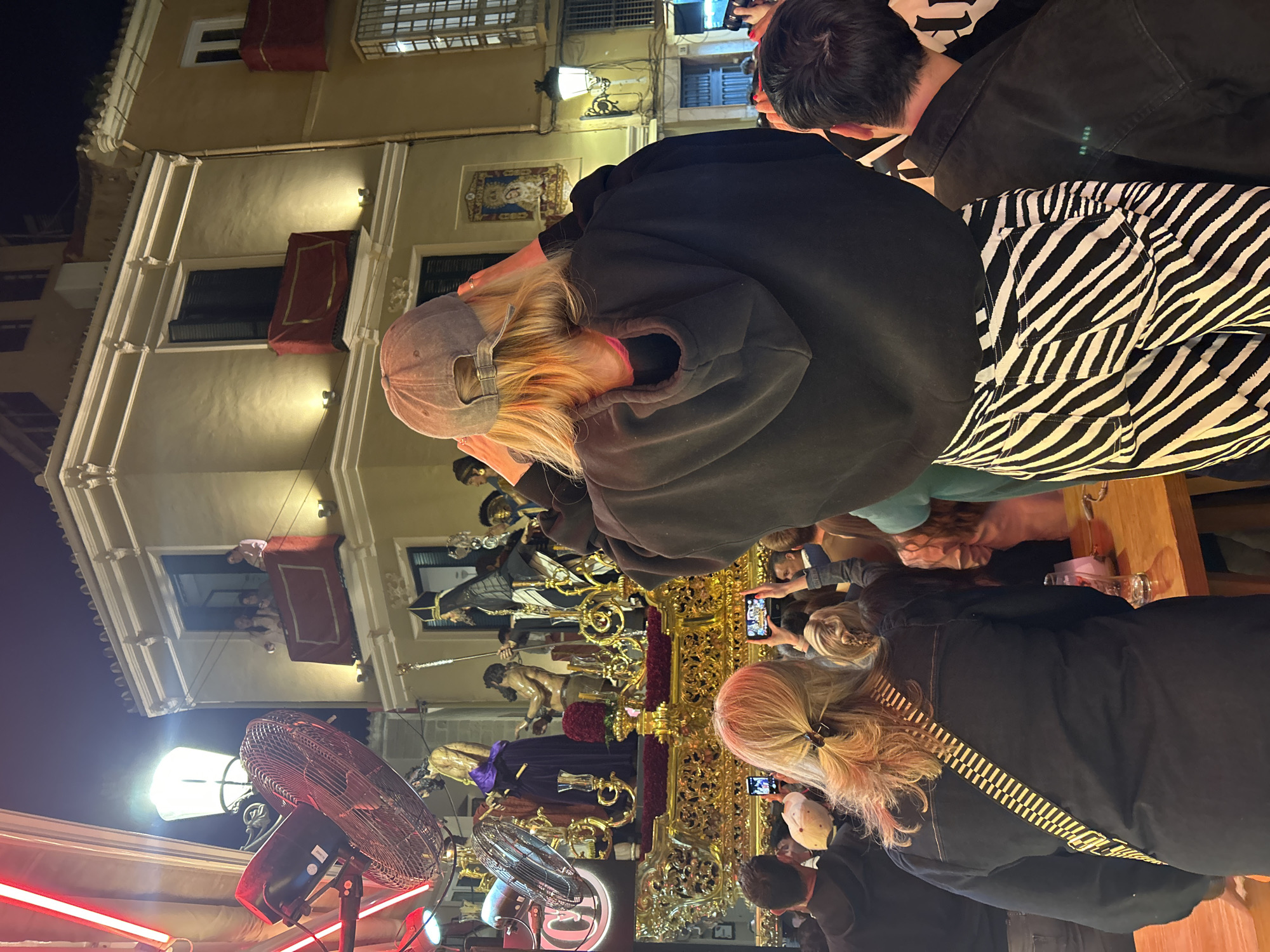 The image captures a street scene in Málaga, Spain, at night, focusing on a religious procession. A large, ornate, golden platform decorated with figures and flowers is being carried through the street, with crowds of people gathered around. Many are holding up their phones to take pictures. Buildings with balconies line the street. One balcony is covered with a red cloth. The lighting is a mix of streetlights and spotlights, with one fan visible on the left. Individuals, including those in casual attire and a person with zebra-striped pants, are part of the crowd.
