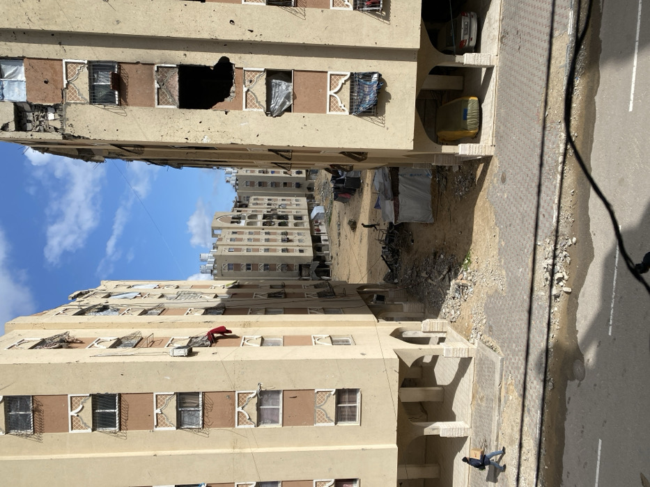 - "The image depicts a damaged urban residential area in Khan Yunis, Palestinian Territory, under a blue sky with scattered white clouds" by FM-GOCB12, licensed under CC BY 4.0