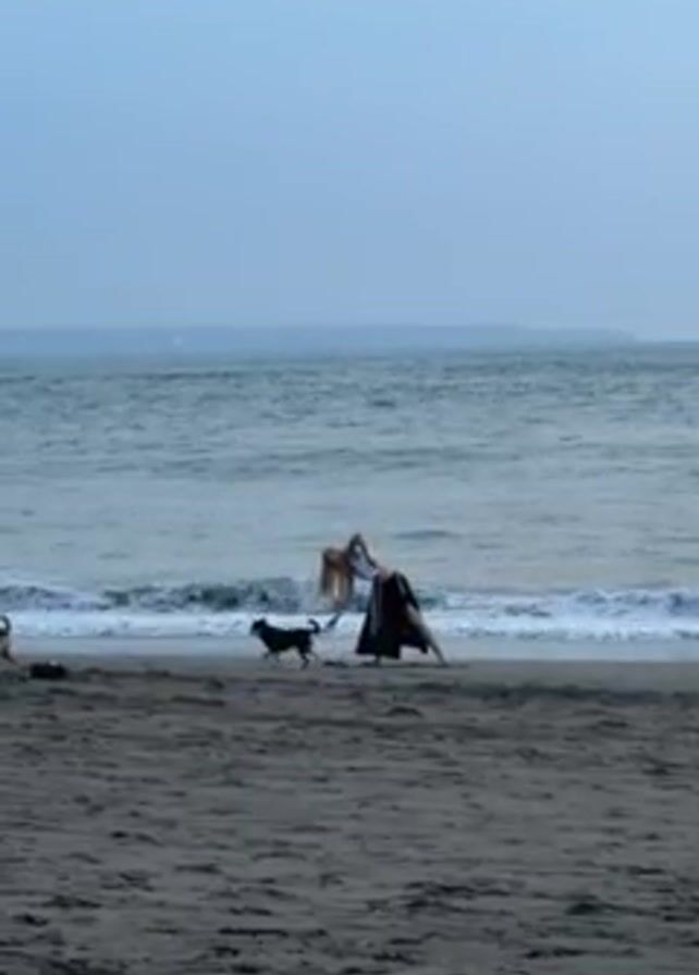 A fair-skinned person with blond hair, wearing a white top and long black skirt with a high slit, is seen in the distance on a beach practicing yoga, near the ocean. There are dogs playing nearby. Two men, shirtless, walk in front of the person. The sand is dark and wet. The sky is overcast.