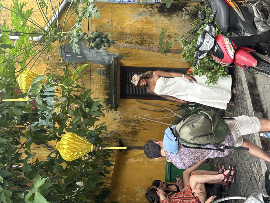 A scene unfolds on a vibrant yellow wall with lush greenery and distinctive yellow lanterns. A woman in a white wrap and patterned hat stands near a closed window. Below, a group of people occupy the scene, with a man wearing a patterned shirt and a green backpack standing over seated women. A parked motorcycle rests along the edge of the image, hinting at a bustling urban location.