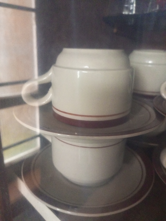 - "A stack of white, cylindrical coffee cups with brown trim, each sitting on a matching saucer" by FM-0hW0q2, licensed under CC BY 4.0