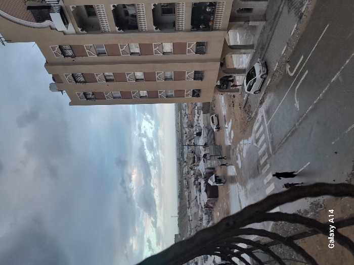 The image captures an elevated view of a street scene in Khan Yunis, Palestinian Territory, under an overcast sky