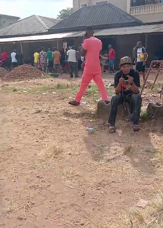 group of people gathered around a dirt lot, some of whom appear to be fighting. There are two men who seem to be the main participants, engaged in what looks like a boxing match. Several others are standing around watching. The setting is a somewhat run-down area with buildings, a roofed structure possibly housing small shops, and a lot of litter on the ground. A man dressed in a pink tracksuit is walking in the foreground, appearing to be on a phone call. Two men are sitting on a concrete block in the foreground of the first shot, observing the activities.