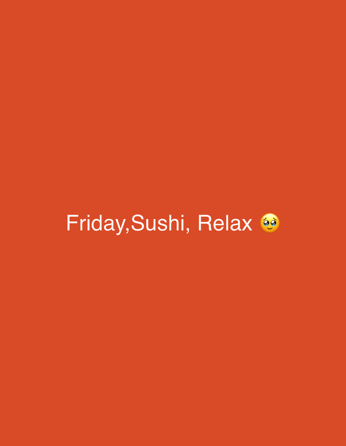 The image displays a solid, uniform orange background. Centered horizontally and slightly below the vertical midline are white sans-serif characters spelling the phrase "Friday,Sushi, Relax". Immediately following "Relax" is a yellow pleading face emoji (🥺). No people, specific objects beyond the text and emoji, actions, or environmental details of a physical location are depicted.