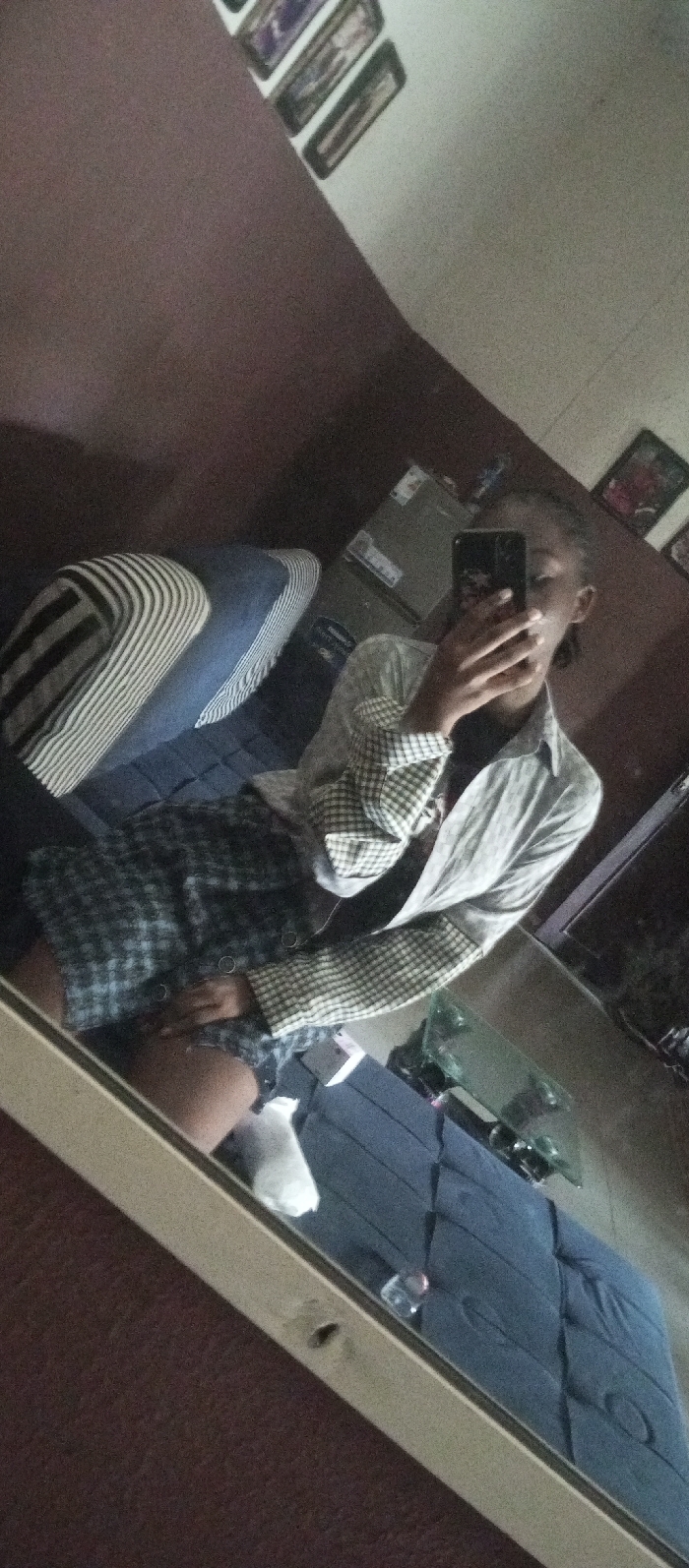 An individual, likely female, is depicted taking a mirror selfie in an indoor setting within Abuja, Nigeria. The subject, positioned centrally, is obscured from the nose up by a dark-colored smartphone held to their face. They wear a light-colored collared shirt with checkered inner sleeve lining and a plaid or checkered skirt with buttons. A single white sock is visible on the subject's left foot. The reflection reveals a dark blue quilted surface, possibly a bed or sofa, adorned with two striped pillows (one black and white, one blue and white). A clear bottle rests on this surface. The background includes a dark brown wall section, a light-colored wall with several framed pictures or artwork, and a partially visible dark-colored table or surface.