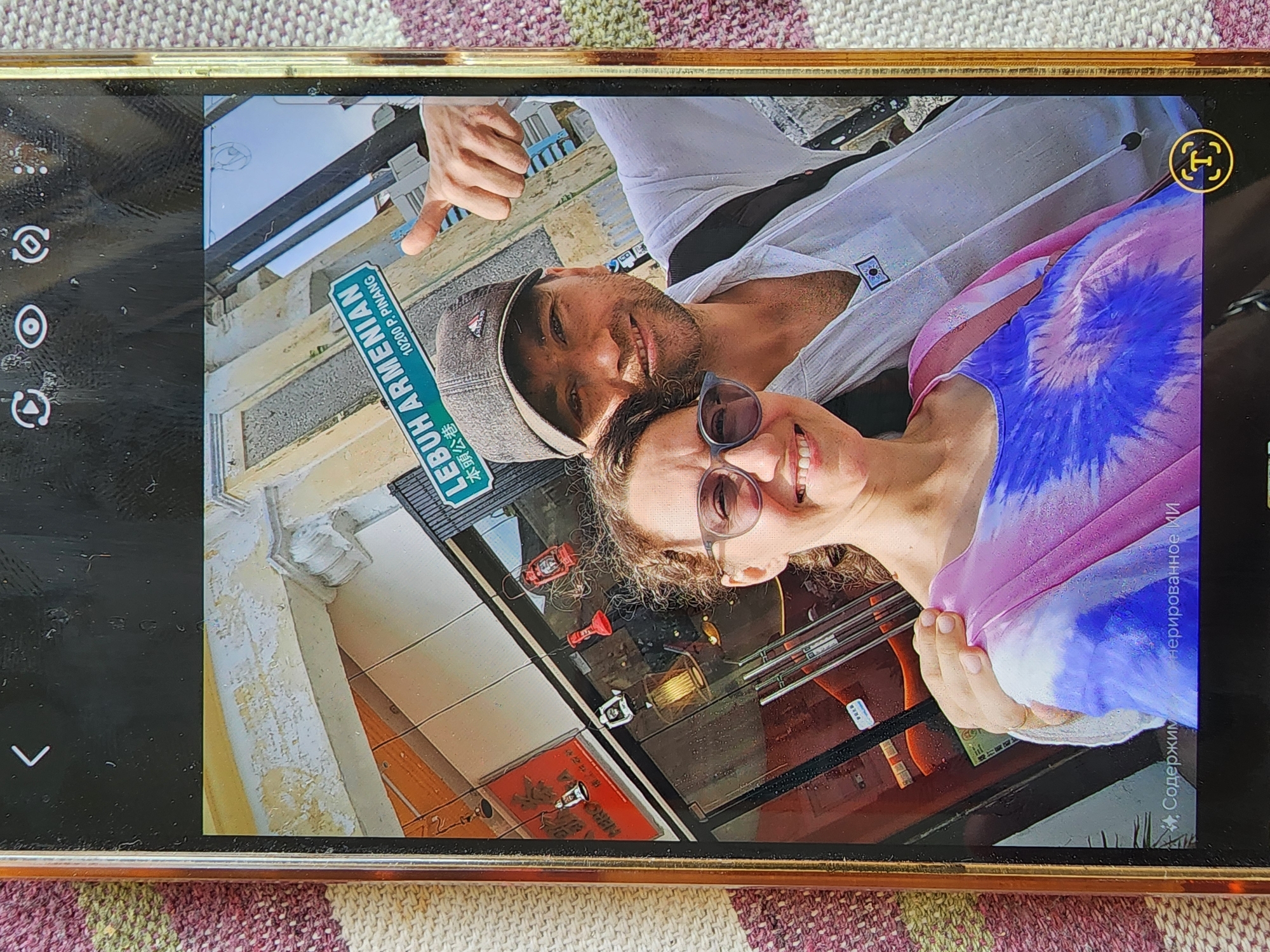 smartphone displaying a photo of a man and woman standing in front of a building with a sign that reads "LEBUH ARMENIAN 10200 P