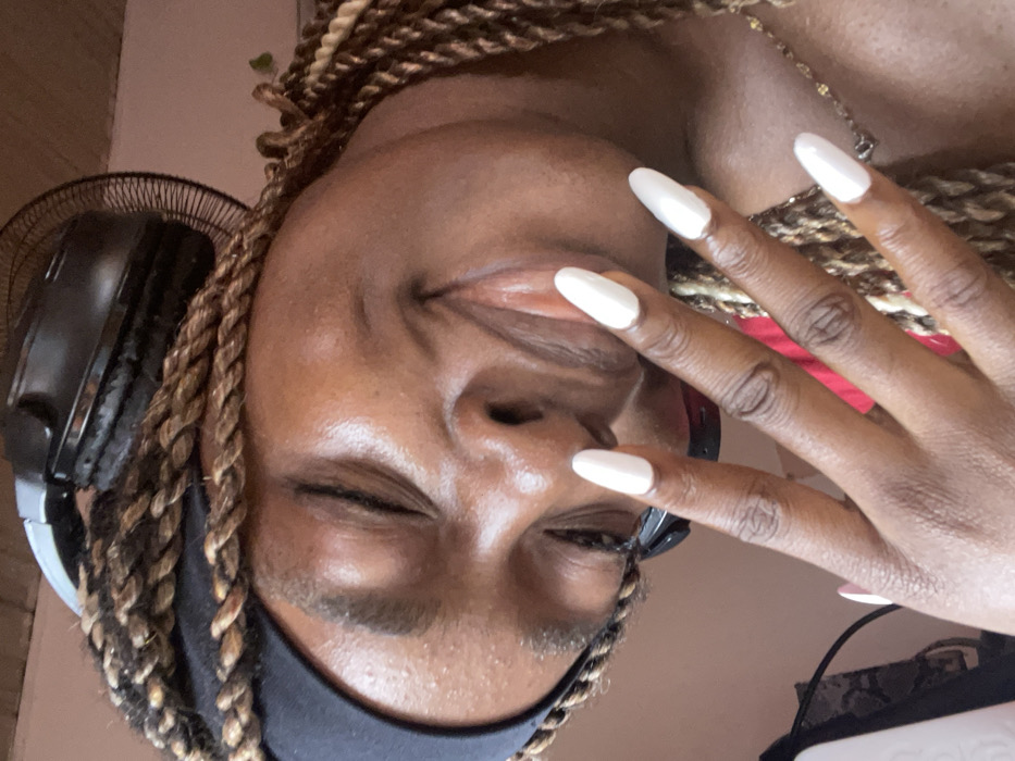 A close-up, tilted image depicts a single individual with dark skin, smiling with eyes closed or squinted and a visible dimple on the left cheek. The individual wears a black headband over light and dark brown braided hair, with black over-ear headphones positioned on the top of the head. Red lipstick is visible on the lips. The person's right hand is raised to the lower left side of their face, showcasing long, almond-shaped fingernails painted with opaque white polish. A gold-colored chain necklace is visible on the right side of the frame, with a hint of red fabric below the hand. The background consists of a plain, light-colored wall, with a black electric fan grille partially visible in the upper right corner. No discernible interactions with other individuals are observed. The scene is situated indoors, in Ado, Nigeria.