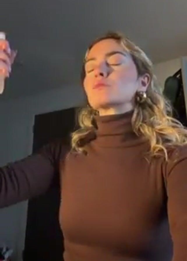 A woman with wavy blonde hair and a brown turtleneck sprays a mist from a white bottle onto her face. She is wearing multiple rings and hoop earrings. After spraying, she gently pats her face. The background includes a doorway, a bed with clothing, and a wall. The lighting in the room is dim.