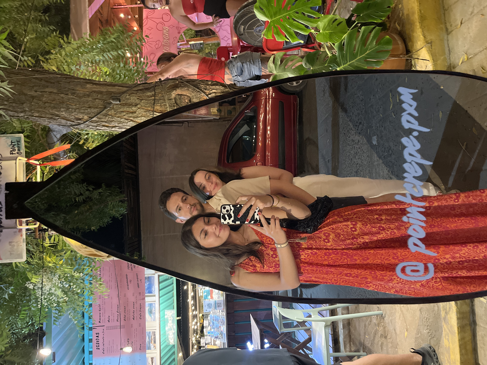 A mirrored selfie of three people, two women and a man, reflects the backdrop of Point Crepe in Brisas de Zicatela, Mexico. A woman in an orange patterned dress holds a cell phone with a cow-print case. The reflection also includes a menu listing beverages and cafe items, part of the restaurant's facade. Outside the mirror's reflection, a scene unfolds with two people in red clothing, one possibly on a vehicle with a fan and plants nearby. A red car is also visible. Part of the mirror has the text "@pointerepe.pxm."