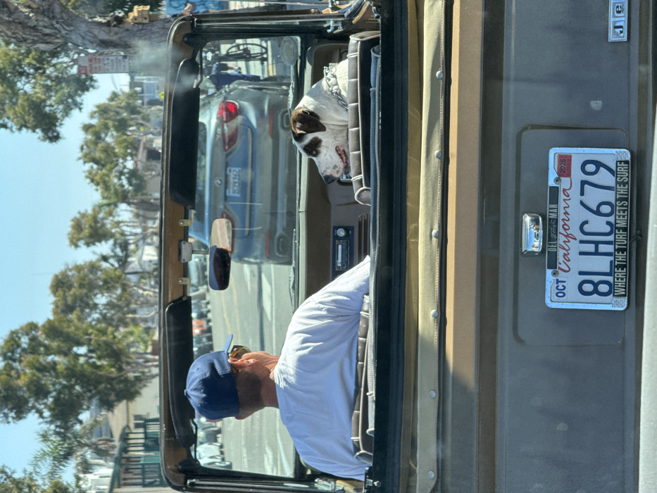 The image depicts a daytime street scene from the rear of a brown or tan open-top vehicle, likely a Jeep, traveling forward. The vehicle displays a California license plate "8LHC679" with an "OCT 2026" registration sticker and a frame reading "WHERE THE TURF MEETS THE SURF," indicating the location is Del Mar, San Diego County, United States of America. Inside the vehicle, an adult male driver is seen from behind, wearing a blue baseball cap, sunglasses, and a white t-shirt. In the front passenger seat, a white and brown/tan patched short-haired dog, wearing a metal chain collar, is looking towards the right side of the vehicle with its mouth slightly open. Ahead of the viewer's vehicle, a dark gray SUV, possibly a BMW, is visible in traffic. The road appears to be a multi-lane street with other vehicles parked along the left curb. On the right side of the road, a person on a bicycle is visible near a utility pole with a "NO PARKING" sign. The street is lined with numerous green trees, including palm trees, and residential buildings with balconies are visible on the left. The sky is clear and blue, indicating sunny weather.
