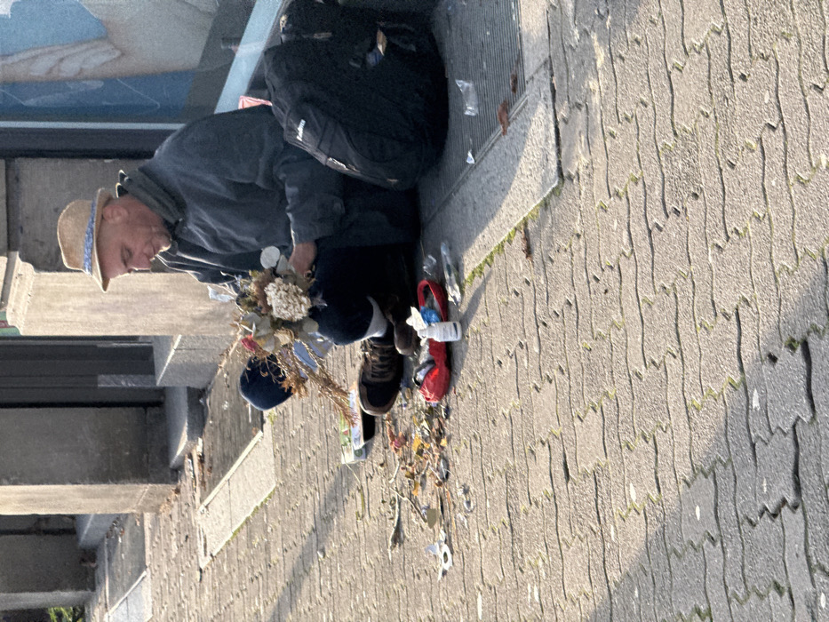 An adult male is observed crouching on a grey interlocking block pavement adjacent to a building wall in Strasbourg, France. The man, appearing middle-aged with a shaved head, wears a light-colored straw fedora with a blue and white patterned band, a dark grey or black long-sleeved jacket/coat, dark trousers, and brown boots. He is holding and examining a bouquet of dried or artificial flowers, composed of various textures and colors, including prominent white/beige elements and reddish stems. His gaze is directed downwards towards the flowers. To his right, a black Karrimor backpack rests upright against the building wall. In front of him on the pavement, a red, open, oval-shaped container holds a small white bottle with a dropper or spray top and other indistinct items. Scattered around this container and extending towards his left foot are numerous pieces of debris, including discarded paper fragments, dried leaves, and other small detritus. A dark blue fabric item, possibly a cap, is visible near his left knee. The building facade behind him features light-colored stone or concrete architectural elements and a darker recessed section, with a partial blue and white graphic visible further right on the wall. The scene is illuminated by natural sunlight, casting distinct shadows.