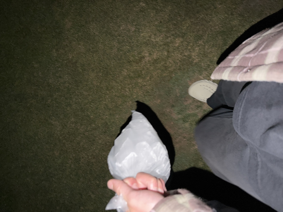 person holding a clear plastic bag filled with an opaque substance. The person is wearing dark jeans, a light-colored shoe, and a plaid jacket. The background appears to be a dark grassy area. The lighting suggests it is nighttime.