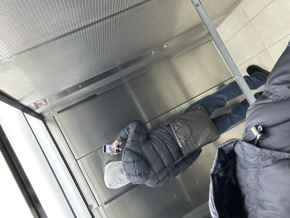 Inside an elevator, a person in a puffer jacket, jeans, and black shoes stands beside a vertical bar. They're angled slightly towards the left, using a smartphone with a visible screen. Another person, also wearing a puffer jacket, partially obscures the view from the right side. A dark patterned bag with a handle is positioned between them. The elevator's interior features a textured ceiling and reflective walls.