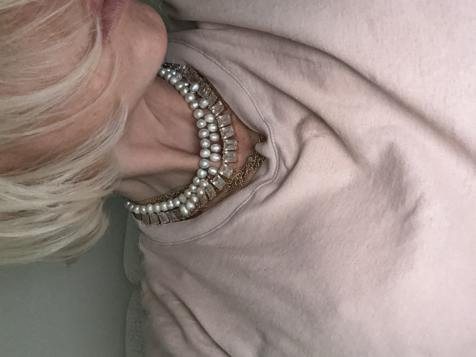 The image depicts a person with blonde hair, wearing a light pink top. Their face is visible from the lips to the temple. The neck is adorned with a layered necklace. The necklace includes strands of pearls, gemstones, and a delicate gold chain. The person is positioned sideways, with the jewelry prominent against the fabric of their top. The overall composition is a close-up, focusing on the jewelry and the neckline.