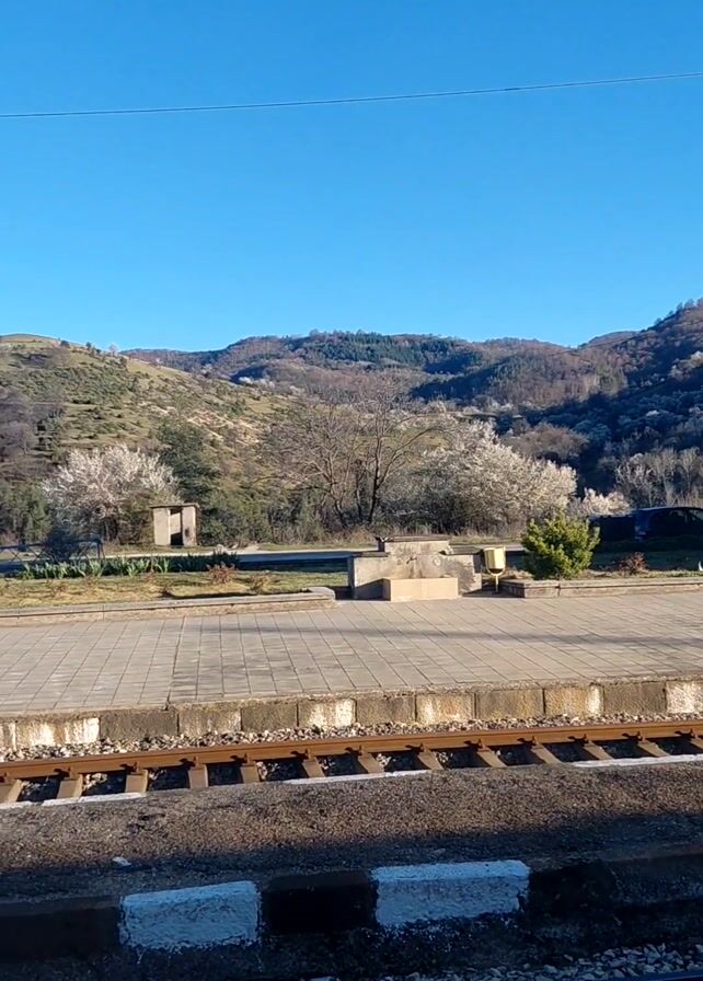 view from a train window, looking out onto a train platform on a bright, clear day. The platform is made of concrete slabs, and there are train tracks running alongside it. In the background, there are rolling hills and mountains, some with trees and bushes growing on them. A small, simple building with a red-tiled roof and light-colored walls sits on the platform. A blossoming tree stands next to the building. Wires for the train's electrical system stretch across the clear blue sky. The video gives the impression of a rural or small-town train station in early spring.