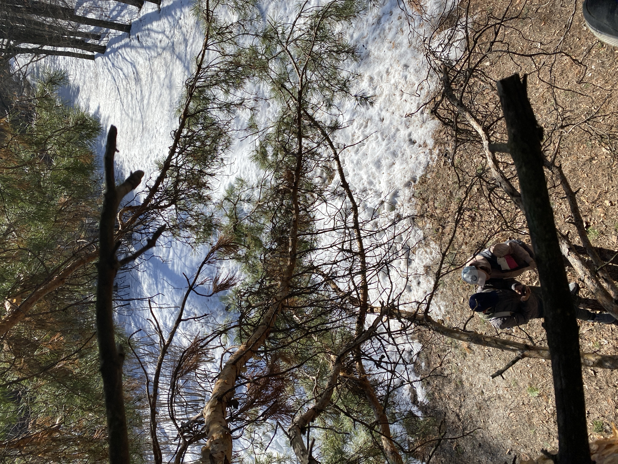 snowy, wooded area with two people visible on the right side of the frame