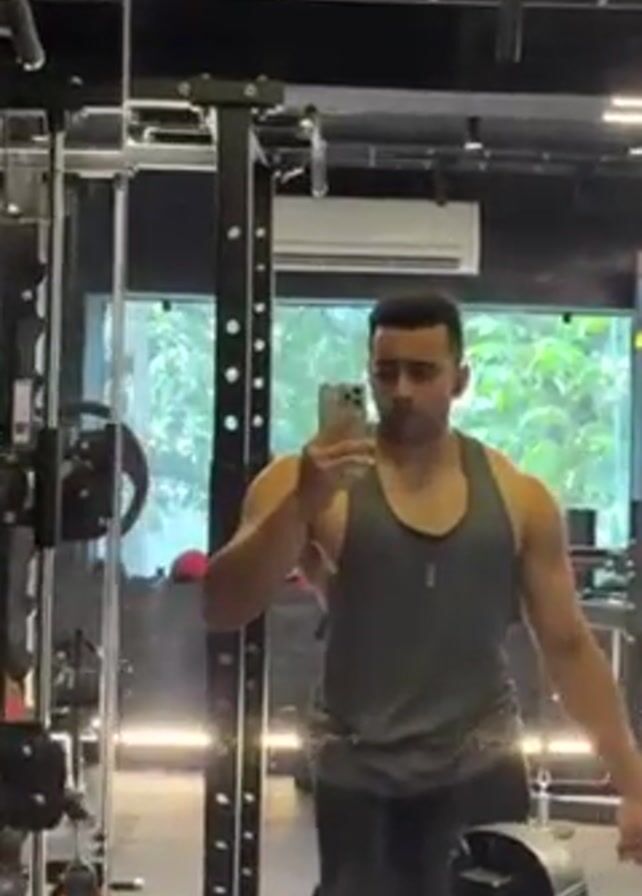 In a gym, a man takes a selfie in front of a mirror. The man is wearing a gray tank top and black sweatpants. He is holding a phone in his right hand. He flexes his right bicep, then his left. The gym has a black ceiling with a modern light fixture. Various gym equipment, including a weight rack and bench, are visible. There is a water bottle and phone on a small table in the foreground. A window reveals trees outside.