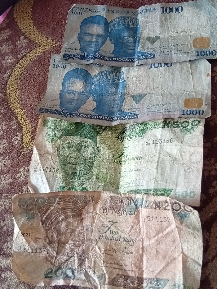 - "The image displays four worn and creased Nigerian Naira banknotes arranged on a brown and red patterned textile surface, likely a rug or carpet, in Zango, Nigeria" by FM-F27nC2, licensed under CC BY 4.0