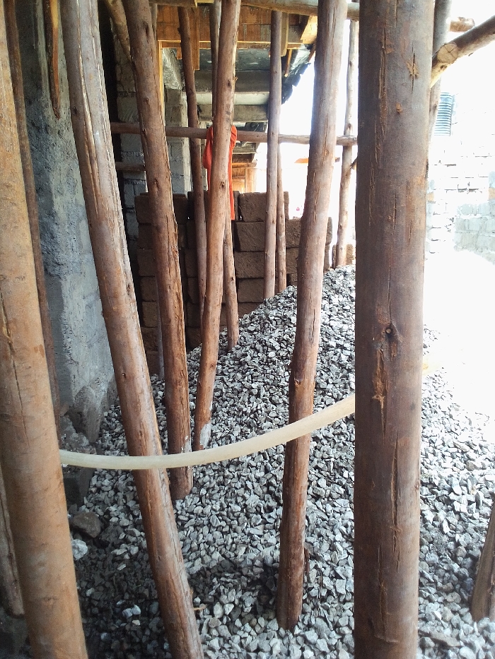 This image captures an indoor or covered construction area in Nakuru, Kenya. The foreground is densely populated by numerous vertically positioned, weathered wooden poles, consistent with scaffolding or support structures, which are embedded in a substantial pile of grey, angular gravel or crushed stone covering the ground. A translucent, light-colored hose is strung horizontally between several of these poles at a low level. In the midground, behind the gravel, a large stack of reddish-brown, rectangular blocks, indicative of unfired clay bricks or mud blocks, is visible against a rough grey wall. Above these blocks and to the left, an orange fabric item hangs. The overhead area reveals additional wooden beams and structural elements. To the far right, a lighter-toned, unfinished masonry wall constructed from grey concrete blocks is visible, featuring a dark, vertically oriented corrugated pipe or tank attached to its surface. Natural light illuminates the scene, casting shadows. No individuals are present within the frame.