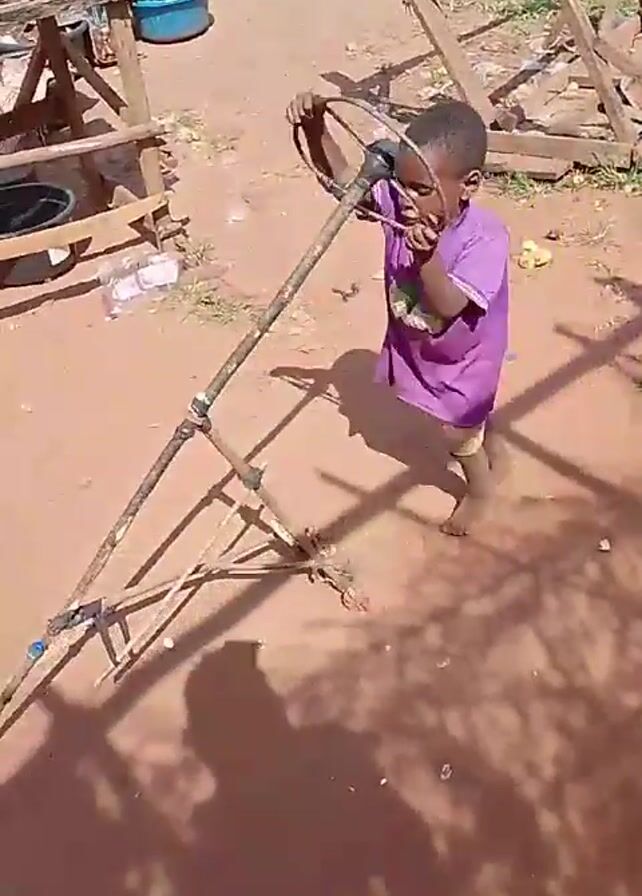 A young child in a purple shirt and tan shorts is standing in a sandy area. The child is playing with a homemade toy vehicle constructed from sticks and plastic pipes. The toy has wheels made of bottle caps. Other children and adults are visible in the background, along with wooden tables displaying produce and other items for sale, suggesting an outdoor market.