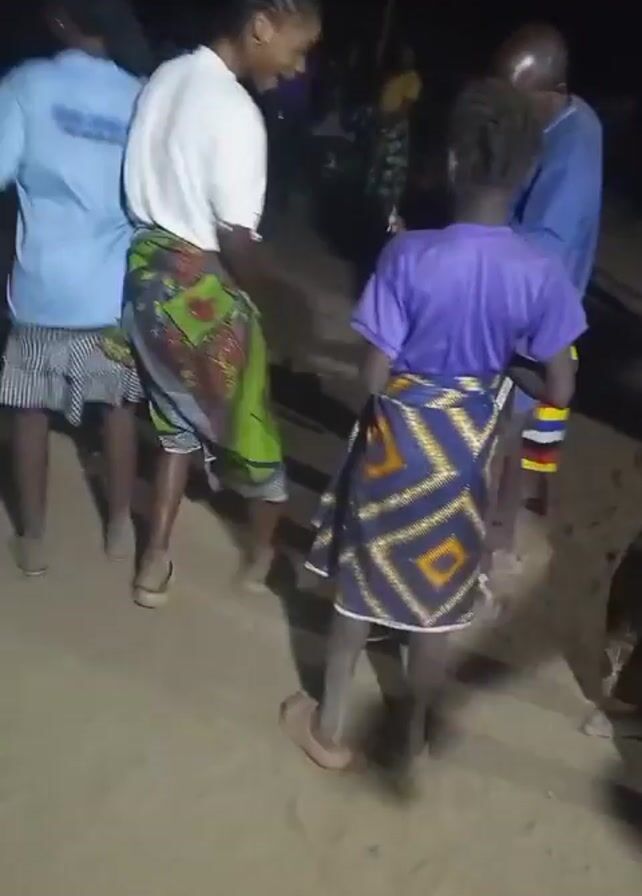 The video captures a group of people dancing in an outdoor setting at night. The area is sandy and dimly lit, with several individuals visible in the background. The focal point is a group of three people. A young person in a purple t-shirt and patterned wrap stands with their back to the camera, seemingly observing the dance. To their left, a woman in a white shirt and green patterned wrap dances briefly before exiting the frame. To the right, a woman in a red shirt and patterned pants energetically dances and moves her hips, enjoying the music. The sound of what appears to be amplified percussion and singing can be heard.