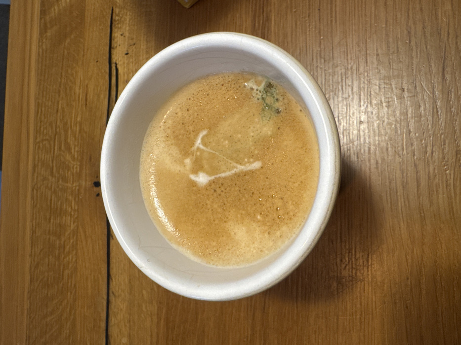 - "An overhead view depicts a white ceramic cup containing a light brown, foamy beverage, likely coffee, positioned on a wooden plank table" by FM-T99Iv1, licensed under CC BY 4.0