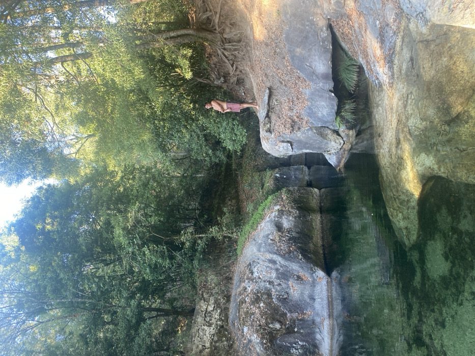 The image displays a natural outdoor scene in Ponte de Lima, Portugal, centered around a clear, green-tinted water body. A sole male individual, shirtless and wearing red-patterned swim shorts, stands barefoot on a large, lichen-covered rocky ledge in the mid-right foreground, facing left with arms bent at the elbows and hands held in front of him. The transparent water reveals submerged light-colored rocks on its bottom, reflecting the overhead foliage. Dense, green trees and thick vegetation form the background and line the banks, with prominent exposed tree roots visible on the right bank near the subject. Large grey boulders flank the water on both sides, with additional rocks visible on the opposite bank to the left. Natural sunlight illuminates the scene, casting reflections on the water's surface and highlighting the dense foliage.