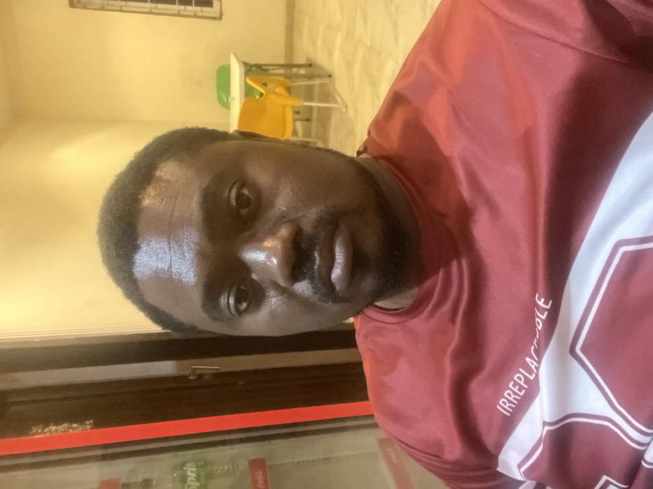 A man with dark skin and a beard is looking at the camera. He is wearing a red shirt with white markings. His face appears sweaty or oily. In the background, there is a room with a table and chair set. A window is also visible. The bottom part of the frame shows a red trim, and blurred objects suggesting a soda refrigerator.