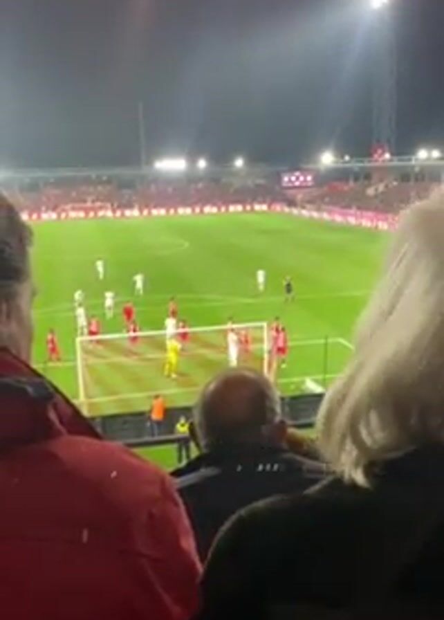 A video taken from stadium seating shows a soccer game in progress at night. The stadium is mostly full with the majority of the crowd out of focus. On the field, players in white uniforms face players in red uniforms on the right side of the field in front of a goal that is closest to the viewer. The goal keeper, dressed in yellow, stands ready. A player in white is standing in front of the goal. There are several people standing and seated in front of the person taking the video, blocking the view of the lower left side of the field.