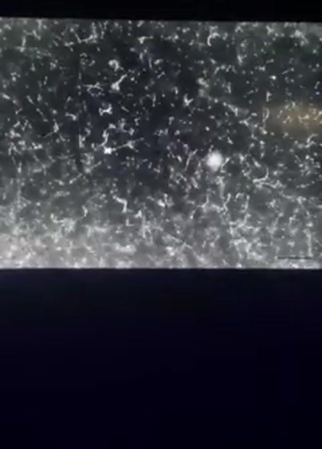 microscopic view of a dark and grainy substance. There are numerous small, irregular white shapes distributed throughout the frame. The material is denser at the bottom of the frame and the overall image appears to be captured through a microscope or similar magnification device.