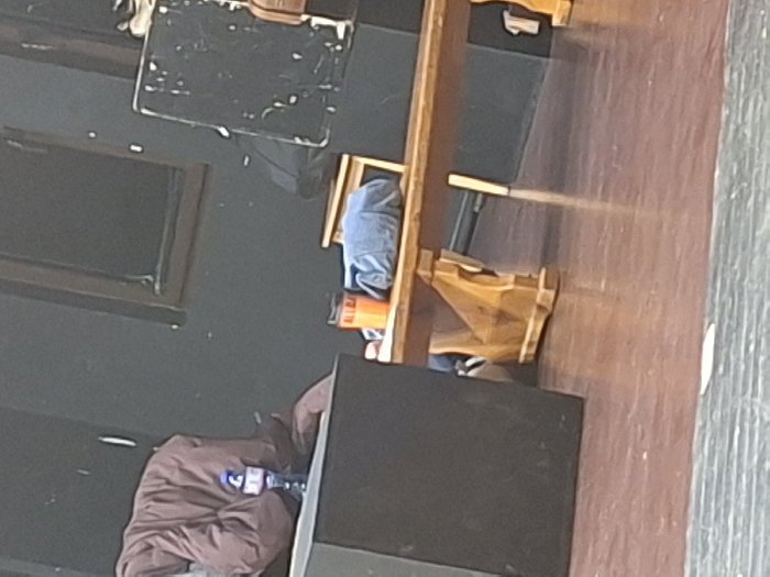 The image displays an indoor scene, likely a stage area or rehearsal space, with a dark grey or black wall forming the background. Two rectangular window frames are visible on this wall. The floor is composed of reddish-brown polished wood or laminate, with a lighter grey horizontal stripe in the immediate foreground. In the left foreground, a large, black, rectangular object, possibly a speaker or stage equipment, stands upright. To the right of this object, a person is partially visible, lying on the floor and mostly obscured by a crumpled brown or burgundy padded jacket. A clear plastic water bottle with a blue cap is positioned upright beside the jacket. Further to the right, a long, light-colored wooden bench with distinctive trestle-style leg supports spans across the midground. An orange insulated cup and a folded blue item of clothing are placed on the bench. In the right background, a dark, rectangular board or prop, featuring scattered white markings, is visible. A light-colored wooden chair is partially seen behind the bench, along with other indistinct dark objects. The exact location within Sofia, Bulgaria, is undeterminable from the provided visual information.