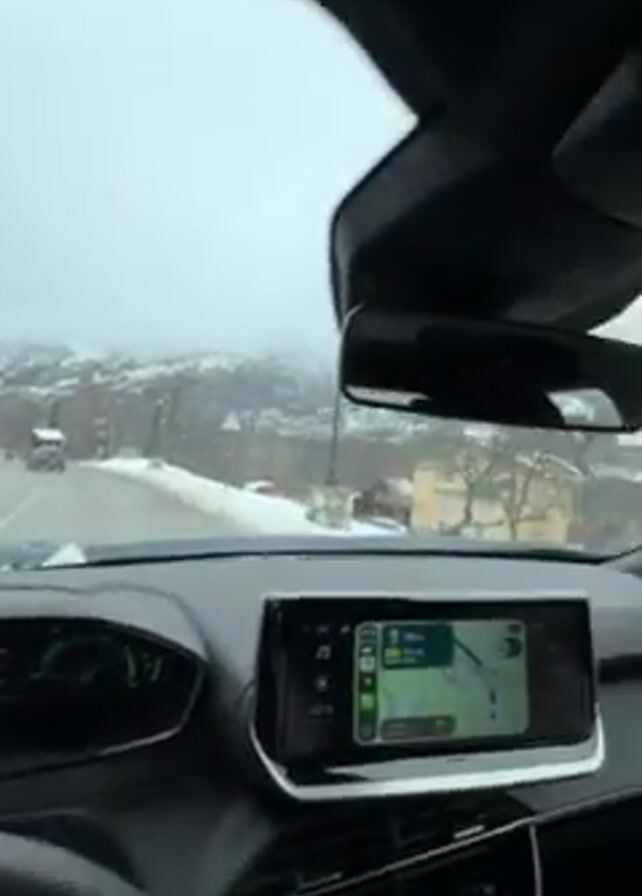 A first-person perspective inside a car driving on a snow-covered mountain road