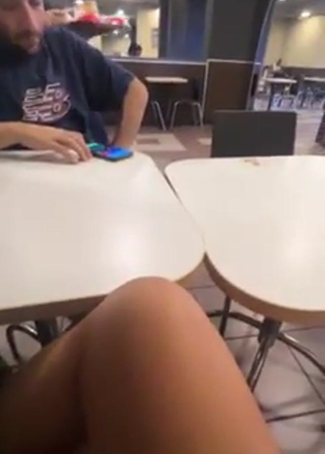 A person sitting at a table films another person as a McDonald's employee delivers a tray with food