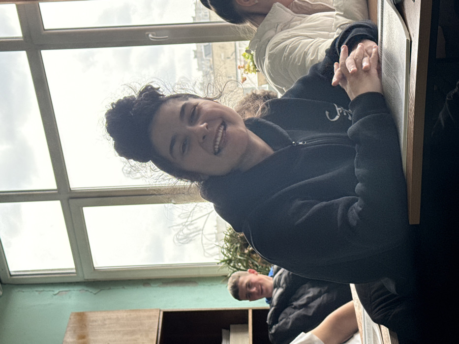 The scene depicts an indoor classroom environment in the city of Cherven Bryag, Bulgaria, illuminated by natural light from a large window. A young woman, estimated to be a student, is positioned centrally in the foreground, seated at a light brown wooden desk. She has dark, curly hair styled in a high bun and is looking directly at the camera with a wide smile, revealing her teeth. She wears a black hooded zipper sweatshirt featuring a white logo or design on the left chest. Her hands are clasped together on an open textbook or notebook resting on the desk. To her left, in the mid-background, another young male student is partially visible, also seated. He has short brown hair, is wearing a blue garment, and is seen smiling while looking towards the camera or the main subject. He is partially obscured by a dark, possibly padded, jacket or blanket. To the main subject's right, a third individual is partially visible, wearing a light-colored puffy jacket, with only the shoulder and part of the head observable. The background is dominated by a large, white-framed window with multiple panes, through which an overcast sky and the outlines of bare trees are visible, along with distant building rooftops. To the immediate left of the window, a wall exhibits areas of peeling light green paint. A section of a light brown wooden cabinet or shelving unit containing stacked items is also visible on the far left. Green foliage, possibly potted plants, is present on the windowsill.
