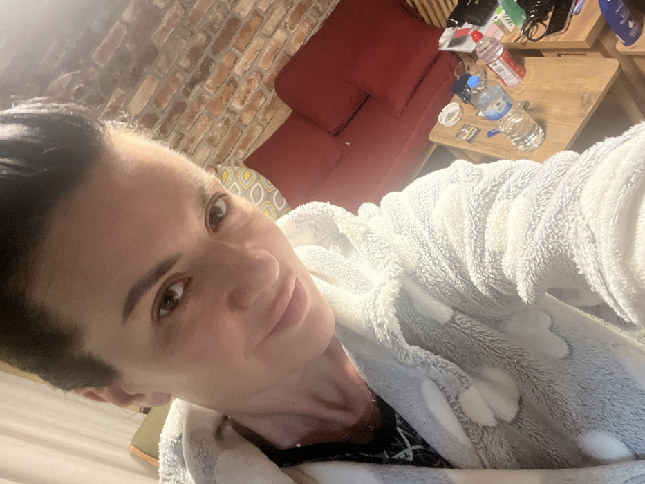 A female individual is depicted in a close-up, selfie-style photograph taken indoors in Beyoğlu, Turkey. She is an adult with dark hair pulled back and styled upwards, brown eyes, and light facial makeup, exhibiting a slight smile. She wears a light gray, plush hooded robe adorned with lighter cloud-like patterns, over a dark patterned top and a delicate gold-colored necklace. The background features an exposed red brick wall on the right and a lighter wall on the left. A red fabric sofa with two visible cushions is positioned behind her, adjacent to a light wooden coffee table. The table holds several plastic water bottles, an ashtray containing cigarette butts, a red plastic bottle, a dark rectangular object, a white tissue packet, and other minor items. A patterned cushion (yellow and gray teardrop motif) is partially visible behind the red sofa. The scene is illuminated by indoor lighting.