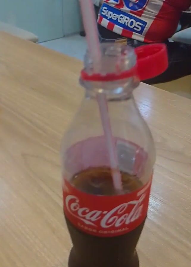 A partially empty bottle of Coca-Cola with a red cap and a pink straw sticking out of it is lying on a wooden surface. A person wearing blue jeans and a backpack with the words "SuperGros" is partially visible in the background.