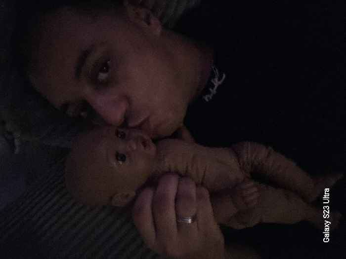 A man lies on his side, kissing the forehead of a plastic baby doll. The man has short hair and is wearing a dark t-shirt with a silver necklace. He is cradling the doll in his hands, which have a silver ring on one finger. The doll is bald with open eyes. The background is dark and shows a striped surface, possibly bedding. The image is labeled "Galaxy S23 Ultra."