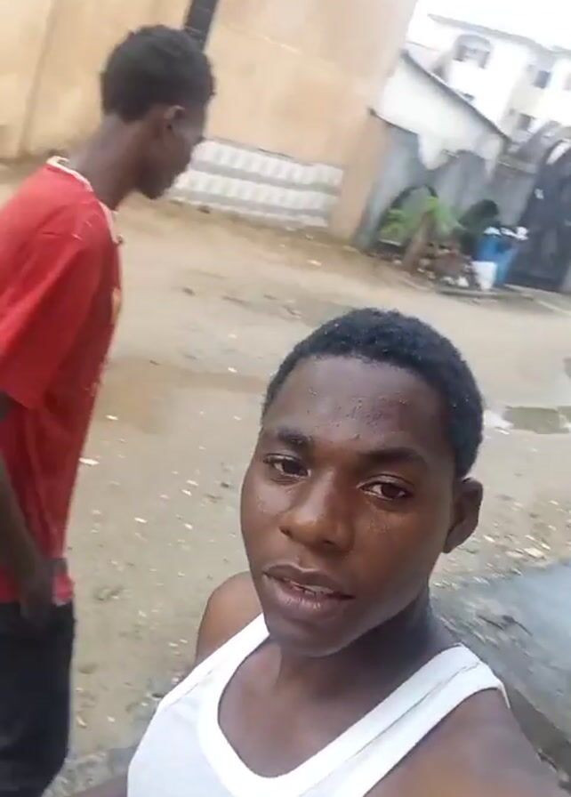 A young Black man in a white tank top is recording himself in a handheld video. He starts off with a serious face, then smiles and laughs. He is outside on a street, with buildings and cars visible in the background. Another Black man walks behind him, wearing a red shirt, then later a black tank top. The video seems to be taken during the day.