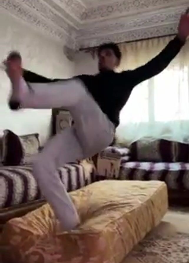 A young man performs a backflip onto a large ottoman in a living room. He is wearing a black long-sleeved shirt, white pants, and socks. The room is decorated in a traditional Moroccan style, with ornate plasterwork on the ceiling, a large mirror, and patterned sofas. The ottoman has a gold and floral pattern. The man smiles after completing the flip.