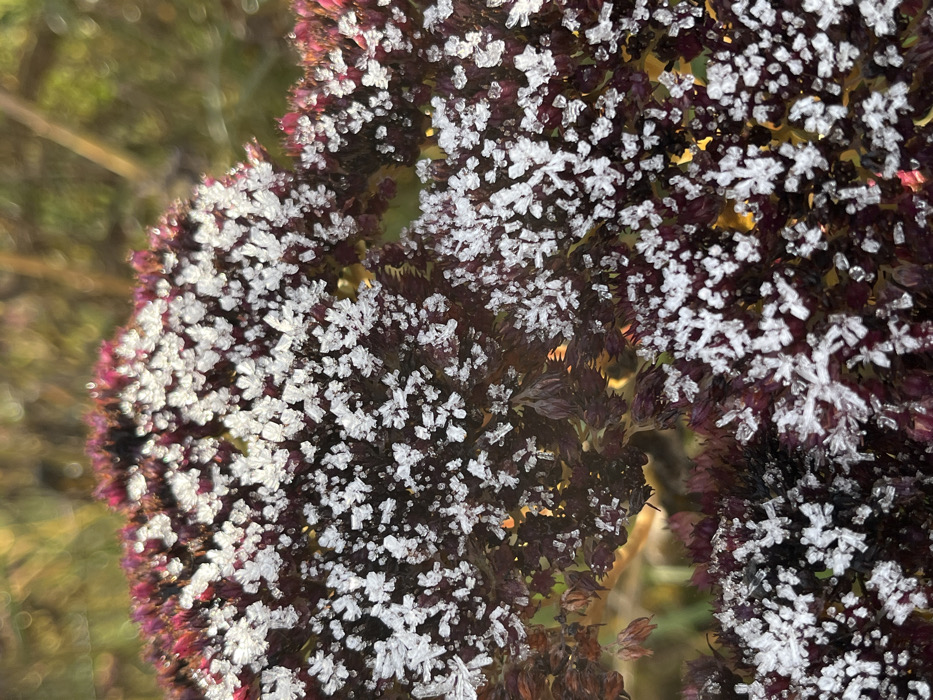 - "The image displays a close-up, macro-level view of a plant with dried, dark reddish-purple flower or seed heads, densely covered in sharp, white crystalline frost particles" by FM-YUBw12, licensed under CC BY 4.0