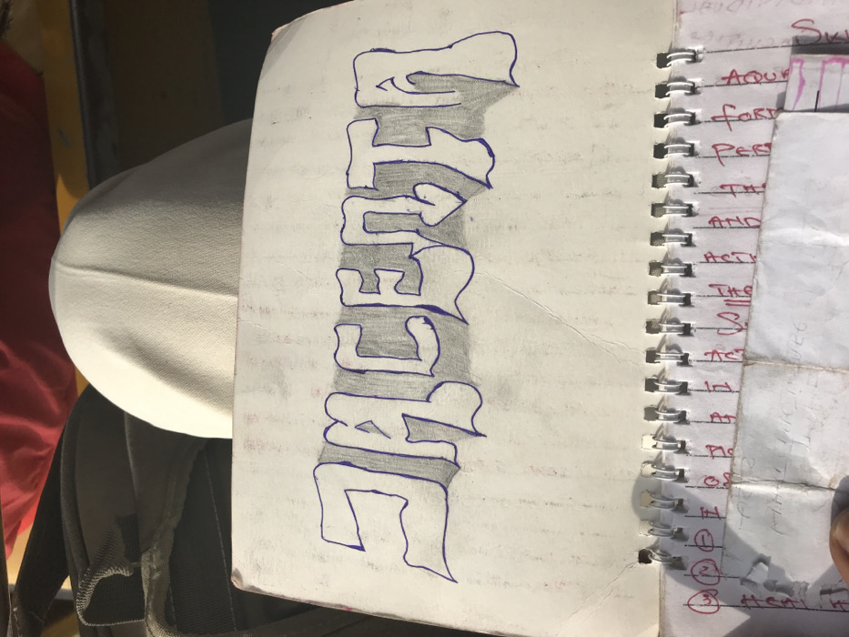 The image presents a close-up, downward-angled view of an open spiral-bound notebook, situated in New Stadium, Nigeria. The top page of the notebook prominently displays the name "JACENTA" rendered in a stylized, graffiti-like bubble font, outlined in blue ink and shaded with graphite pencil to create a three-dimensional appearance. Below the metallic spiral binding, a secondary page reveals handwritten text, with legible words including "Aqua," "Forest," "The," "Skill," "Act," "and," "person," "AQUIA," and "SMOOTH," some of which have letters circled in red ink. A human hand is partially visible in the lower-left foreground, gripping the notebook. Directly behind the notebook, a light-colored, possibly white or off-white, pleated fabric consistent with clothing is discernible, indicating the notebook is resting on a lap or similar surface. The upper left background features a dark olive green fabric item, possibly a bag. To the upper right, a red fabric object is present, with a distinct yellow horizontal stripe visible behind it.