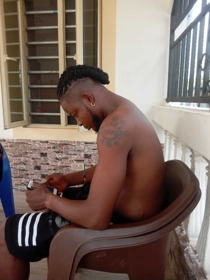 A male individual is observed seated on a brown plastic chair in what appears to be a covered porch or balcony setting in the city of Igbenu, Nigeria. The subject, with dark skin, wears his hair in dark dreadlocks styled with a faded undercut, and has a short beard and goatee. He is shirtless, revealing a prominent dark tattoo on his left shoulder and upper arm, and wears a small golden hoop earring in his left ear. A multi-colored beaded bracelet is present on his left wrist. He is wearing black shorts with three distinct white vertical stripes on the outer side of the left thigh. Both hands are engaged with a white smartphone, upon which his gaze is directed downwards as he interacts with the device. The immediate background to the left features a cream-colored wall with a prominent window unit, consisting of multiple glass panes and horizontal security bars. Below the window, a section of the wall is clad in rectangular, textured grey and brown tiles, with two white electrical outlets visible. To the right of the subject, a black metal railing with vertical bars is present, suggesting an open-air boundary. The overall structure appears to have cream or light beige colored walls.