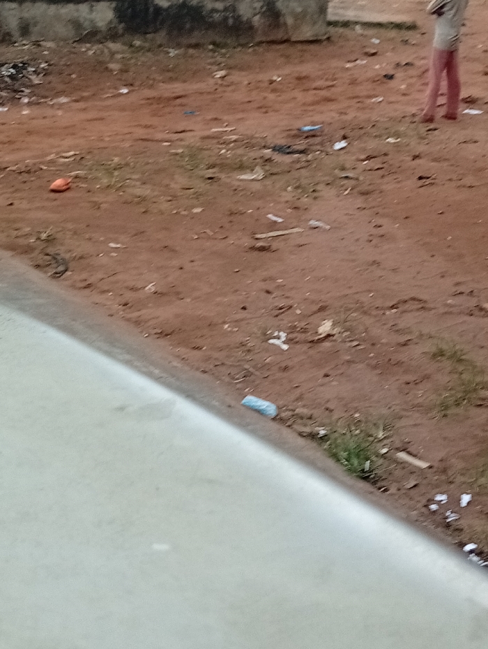 A dirt ground is scattered with litter: paper scraps, a blue bottle, and an orange object