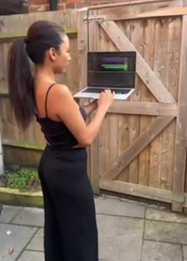 A woman stands outside in a yard holding a laptop. She wears a black tank top and pants. Her hair is pulled back into a ponytail. She looks at the laptop screen and types on the keyboard. The laptop screen displays what appears to be an audio or video editing program. Behind her is a wooden fence and a brick building. The ground is paved.
