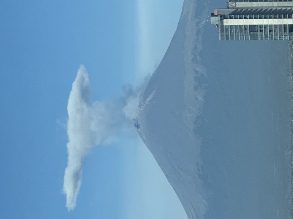 The image displays a panoramic view of the Popocatépetl volcano, actively erupting, observed from Puebla City, Mexico, under a clear blue sky. The volcano, a prominent conical stratovolcano, occupies the central and upper-left portions of the frame, exhibiting a grey-blue hue with visible surface textures. From its summit crater, a column of light grey ash and/or steam rises vertically, then spreads horizontally into a distinct, broad, and flat-topped cloud formation, resembling an anvil or mushroom cloud. In the lower right quadrant, a modern, multi-story building with a light-colored facade and dark-paned windows is partially visible, indicating an urban setting. A portion of a second, similar structure is discernible behind the first. No individuals or specific interactions are visible. The environment suggests a bright, clear day, providing unobstructed visibility of the distant volcanic activity and the local cityscape.