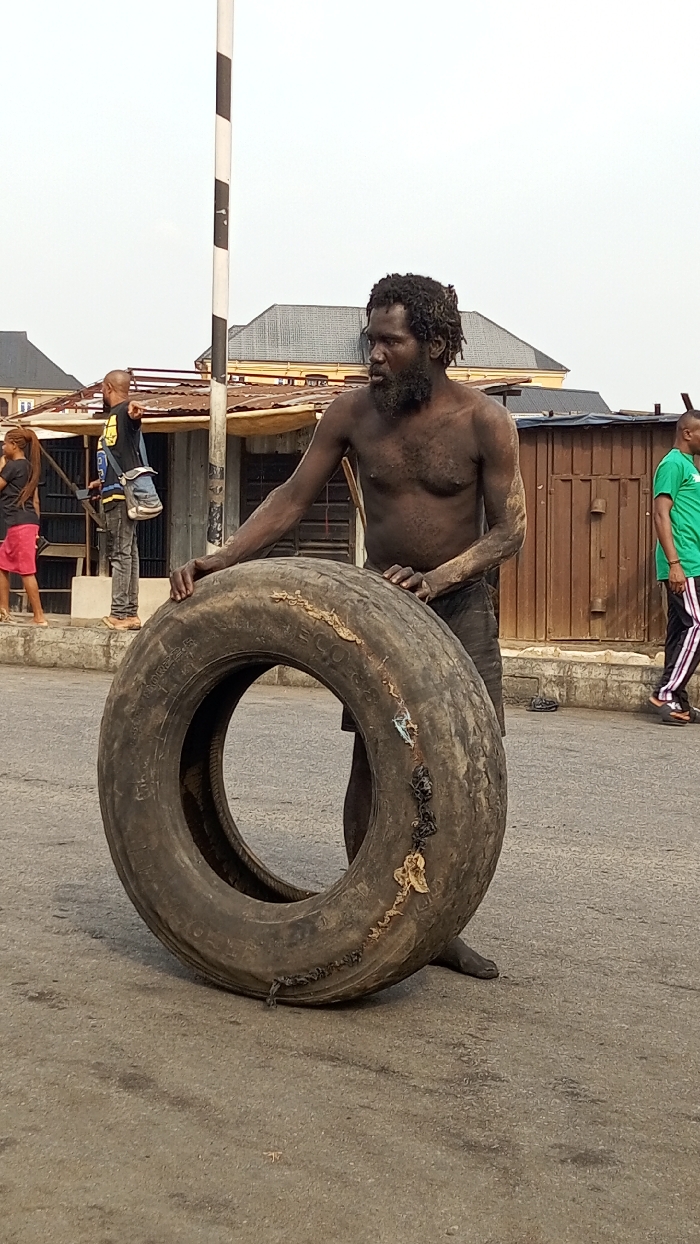 The scene is an outdoor urban area in Agburu Uke, Nigeria, under an overcast sky. A dark-skinned adult male, shirtless with a beard and dreadlocked hair, stands in the foreground-center, grasping a large, heavily worn black 12.00R22.5 vehicle tire vertically on paved ground. His exposed skin, particularly on his arms, appears soiled. The tire exhibits significant wear, exposed cords, and visible debris including what appears to be adhesive residue and frayed material. In the mid-ground, a black-and-white striped utility pole rises on the left. Three other individuals are present in the background: a male in a dark shirt and jeans, a female in a red skirt, and a male in a green t-shirt and dark track pants. Behind them, multiple single-story structures with corrugated metal roofs and varied facades are visible, indicative of commercial or residential buildings. The ground is paved, appearing to be asphalt or concrete.