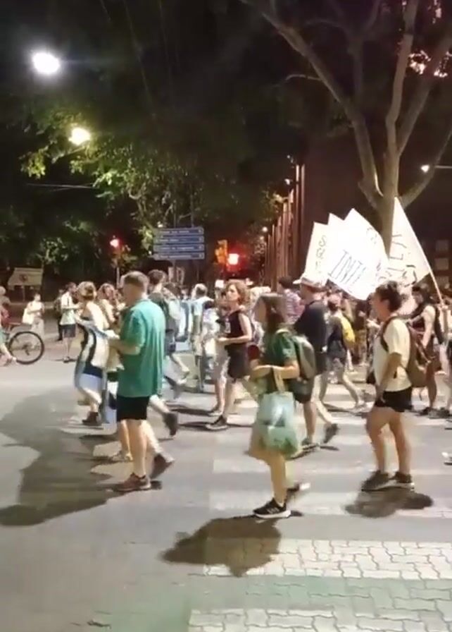 At night, a crowd of diverse people are crossing a crosswalk at a traffic light. They carry signs and flags and appear to be marching or protesting. The environment includes streetlights, trees, and brick buildings. The crowd includes people of various ages and clothing styles.