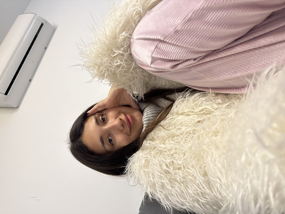 A young woman is depicted indoors, in what is understood to be the city of Budva, Montenegro. She is seated, facing the camera with a faint smile, her dark hair long and cascading over her shoulders. Her right hand rests gently against the right side of her face. She is wearing a light-colored, shaggy faux fur coat over a grey, ribbed turtleneck sweater. Her lower body is clad in light pink, vertically ribbed pants. The background consists of a plain white wall, with a white, rectangular air conditioning unit mounted high on the wall in the upper right portion of the frame. A grey surface, possibly part of a couch or chair, is visible to her left.