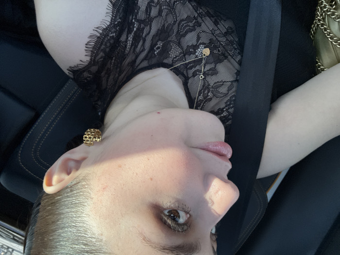 A woman is shown in a selfie inside a car, wearing a black lace top, gold necklace, and a chunky gold earring