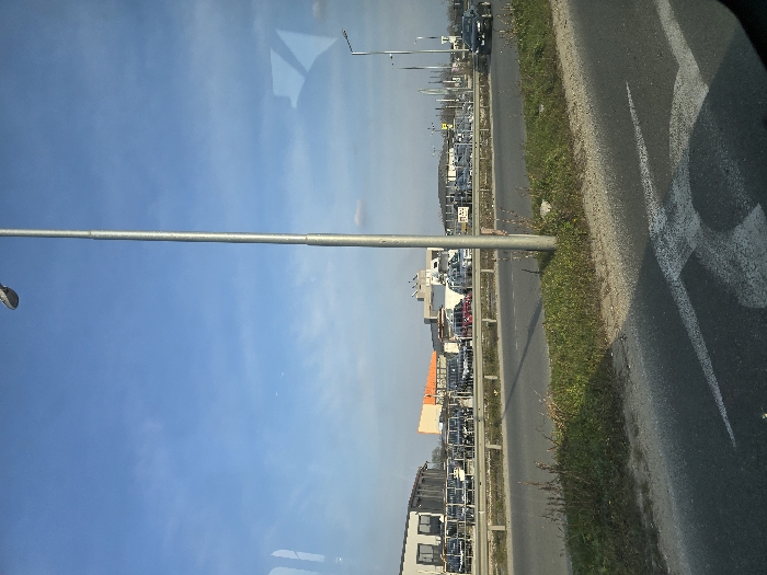 This image captures a daytime scene along a roadside in Stroevo, Bulgaria. In the foreground, a section of asphalt road exhibits faded white directional markings, possibly indicating a turn. To the right, an unkempt strip of green and brown grass runs parallel to the road. A prominent, tall, slender grey metallic lamppost with a modern fixture at its apex is centrally positioned on this grassy strip. Beyond the grassy verge, a multi-lane asphalt road or highway is visible, separated by a metal guardrail. A dark-colored sedan, possibly a BMW, is observed on the far right lane of this road, traveling away from the viewer. The background reveals an expansive commercial or industrial complex. Numerous vehicles, predominantly utility vans and trucks, are parked in orderly rows across multiple open-air lots. Several commercial buildings are present, including a two-story structure with a light-colored facade to the far left, and a building with a distinctive orange roof further right. Additional streetlights and utility poles are distributed throughout the background area. The sky overhead is predominantly clear and blue, with sparse, wispy white clouds. Reflections of an interior space are visible on the upper left and right sections of the image, superimposed over the sky, suggesting the photograph was taken through a window.